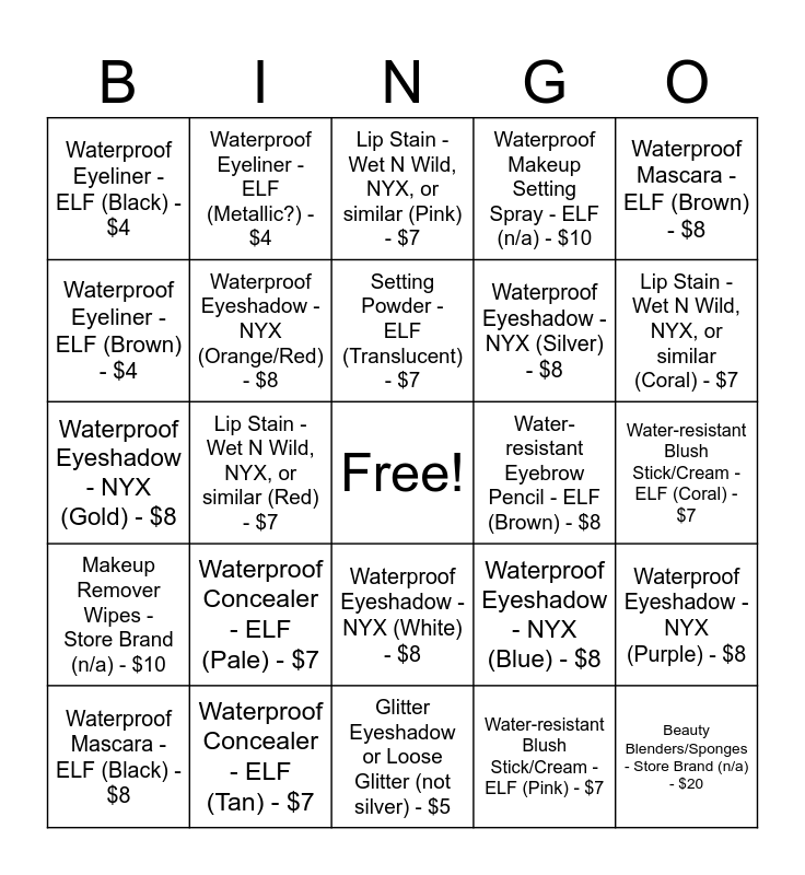 This bingo card has a free space and 24 words: Waterproof Concealer - ELF (Pale) - $7, Waterproof Concealer - ELF (Tan) - $7, Setting Powder - ELF (Translucent) - $7, Waterproof Mascara - ELF (Black) - $8, Waterproof Mascara - ELF (Brown) - $8, Waterproof Eyeliner - ELF (Black) - $4, Waterproof Eyeliner - ELF (Brown) - $4, Waterproof Eyeliner - ELF (Metallic?) - $4, Water-resistant Eyebrow Pencil - ELF (Brown) - $8, Waterproof Eyeshadow - NYX (White) - $8, Waterproof Eyeshadow - NYX (Silver) - $8, Waterproof Eyeshadow - NYX (Gold) - $8, Waterproof Eyeshadow - NYX (Blue) - $8, Waterproof Eyeshadow - NYX (Purple) - $8, Waterproof Eyeshadow - NYX (Orange/Red) - $8, Water-resistant Blush Stick/Cream - ELF (Pink) - $7, Water-resistant Blush Stick/Cream - ELF (Coral) - $7, Lip Stain - Wet N Wild, NYX, or similar (Pink) - $7, Lip Stain - Wet N Wild, NYX, or similar (Coral) - $7, Lip Stain - Wet N Wild, NYX, or similar (Red) - $7, Beauty Blenders/Sponges - Store Brand (n/a) - $20, Makeup Remover Wipes - Store Brand (n/a) - $10, Waterproof Makeup Setting Spray - ELF (n/a) - $10 and Glitter Eyeshadow or Loose Glitter (not silver) - $5.
