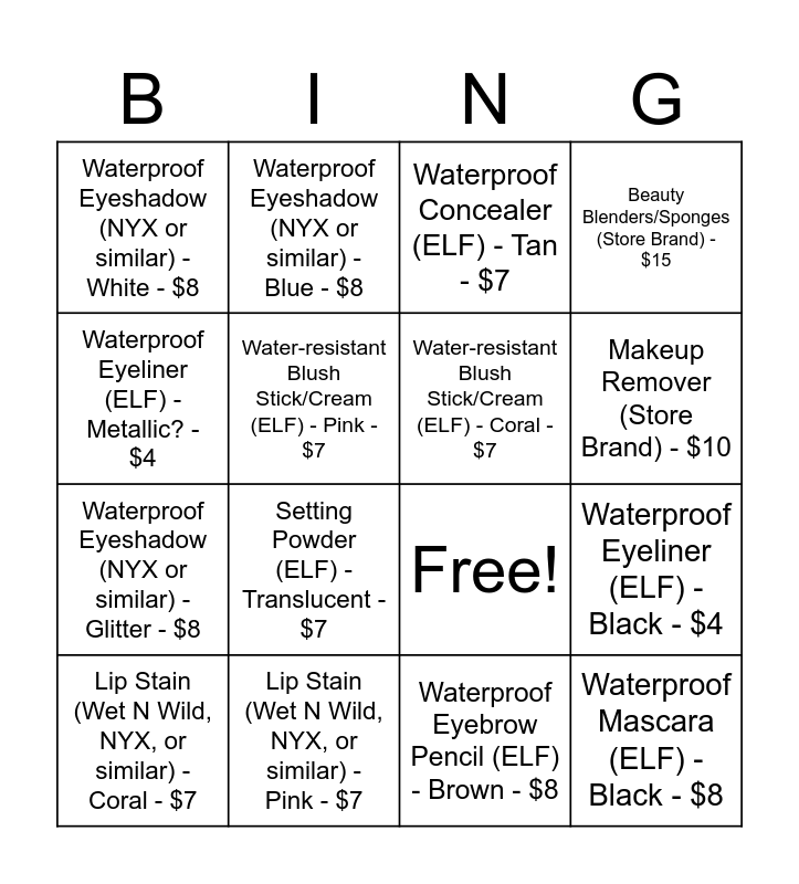 This bingo card has 19 words: Free!, Waterproof Concealer (ELF) - Pale - $7, Waterproof Concealer (ELF) - Tan - $7, Waterproof Mascara (ELF) - Black - $8, Waterproof Eyeliner (ELF) - Black - $4, Waterproof Eyeliner (ELF) - Metallic? - $4, Waterproof Eyebrow Pencil (ELF) - Brown - $8, Waterproof Eyeshadow (NYX or similar) - White - $8, Waterproof Eyeshadow (NYX or similar) - Blue - $8, Waterproof Eyeshadow (NYX or similar) - Glitter - $8, Setting Powder (ELF) - Translucent - $7, Water-resistant Blush Stick/Cream (ELF) - Pink - $7, Water-resistant Blush Stick/Cream (ELF) - Coral - $7, Lip Stain (Wet N Wild, NYX, or similar) - Pink - $7, Lip Stain (Wet N Wild, NYX, or similar) - Coral - $7, Lip Stain (Wet N Wild, NYX, or similar) - Red - $7, Beauty Blenders/Sponges (Store Brand) - $15, Makeup Remover (Store Brand) - $10 and Waterproof Makeup Setting Spray (ELF) - $10.