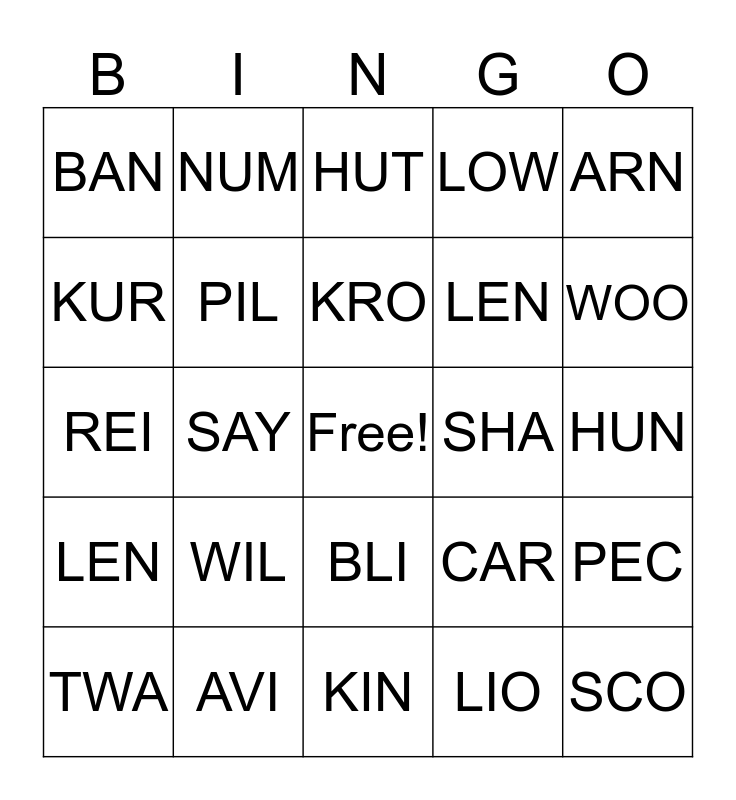 This bingo card has a free space and 24 words: WIL, AVI, KRO, TWA, ARN, BAN, KUR, NUM, SHA, BLI, LEN, REI, CAR, PEC, PIL, LIO, HUN, HUT, WOO, SAY, SCO, LEN, LOW and KIN.
