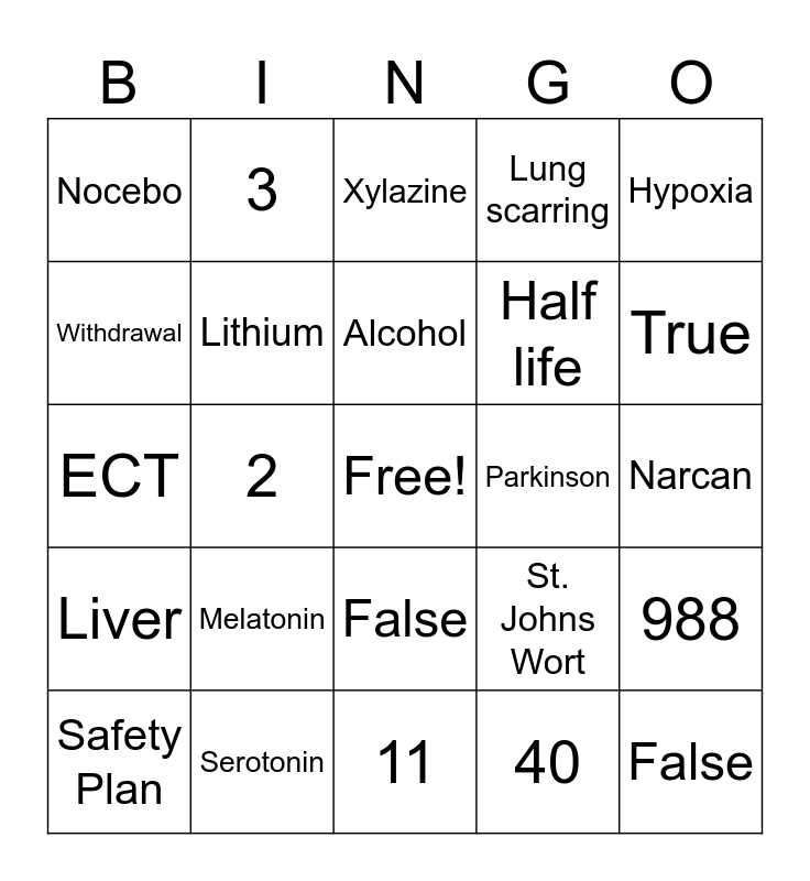 This bingo card has a free space and 24 words: Melatonin, Serotonin, Alcohol, Safety Plan, Hypoxia, Nocebo, Withdrawal, 3, Parkinson, False, Half life, ECT, St. Johns Wort, 988, Lithium, 40, Narcan, Xylazine, True, 2, False, Liver, Lung scarring and 11.