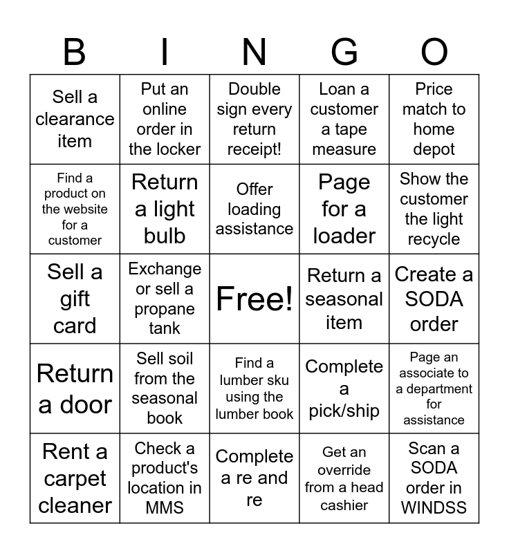 This bingo card has a free space and 40 words: Wipe down the counters, Sell a gift card, Activate a VIP Pro account, Return a light bulb, Check a product's location in MMS, Find a lumber sku using the lumber book, Offer loading assistance, Tell a customer where the washrooms are, Price match to home depot, Return a door, Exchange or sell a propane tank, Loan a customer a tape measure, Scan a SODA order in WINDSS, Create a SODA order, Return a seasonal item, Sell soil from the seasonal book, Look up a mother and baby sku for a customer, Sell a clearance item, Complete the closing customer service checklist, Double sign every return receipt!, Page an associate to a department for assistance, Get an override from a head cashier, Page for a loader, Find a product on the website for a customer, Convert a Lowe’s item number to MMS number, Deactivate a product on the scanners, Sell an extended protection plan, Rent the van, Non-receipt return onto a merch card, Cancel/Refund an online order, Call a customer for pick up, Rent a carpet cleaner, Return a faucet, Complete a pick/ship, Show the customer the light recycle, Complete a re and re, Return a box of nails, Direct a customer to plumbing, Put an online order in the locker and Return a carpet cleaner.
