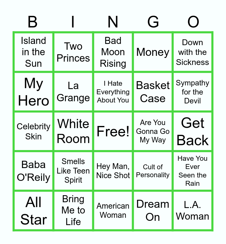 This bingo card has a free space and 24 words: Smells Like Teen Spirit, Bring Me to Life, I Hate Everything About You, All Star, Down with the Sickness, Island in the Sun, My Hero, Two Princes, Are You Gonna Go My Way, Hey Man, Nice Shot, Basket Case, Celebrity Skin, Cult of Personality, Have You Ever Seen the Rain, La Grange, Dream On, Get Back, Bad Moon Rising, Sympathy for the Devil, White Room, L.A. Woman, Baba O'Reily, Money and American Woman.