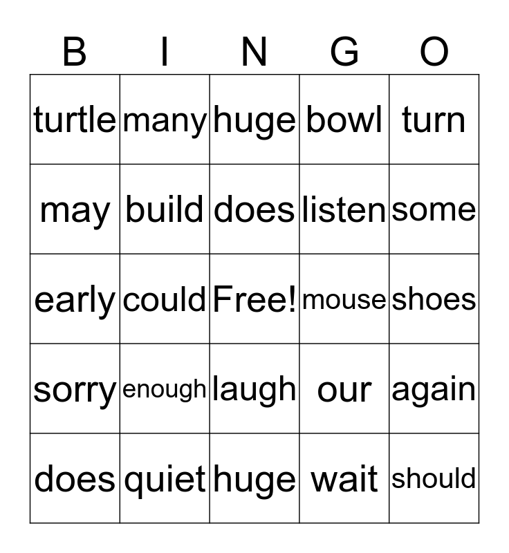 This bingo card has a free space and 24 words: enough, quiet, does, does, turn, turtle, may, many, mouse, laugh, listen, early, our, again, build, wait, shoes, huge, some, could, should, sorry, bowl and huge.