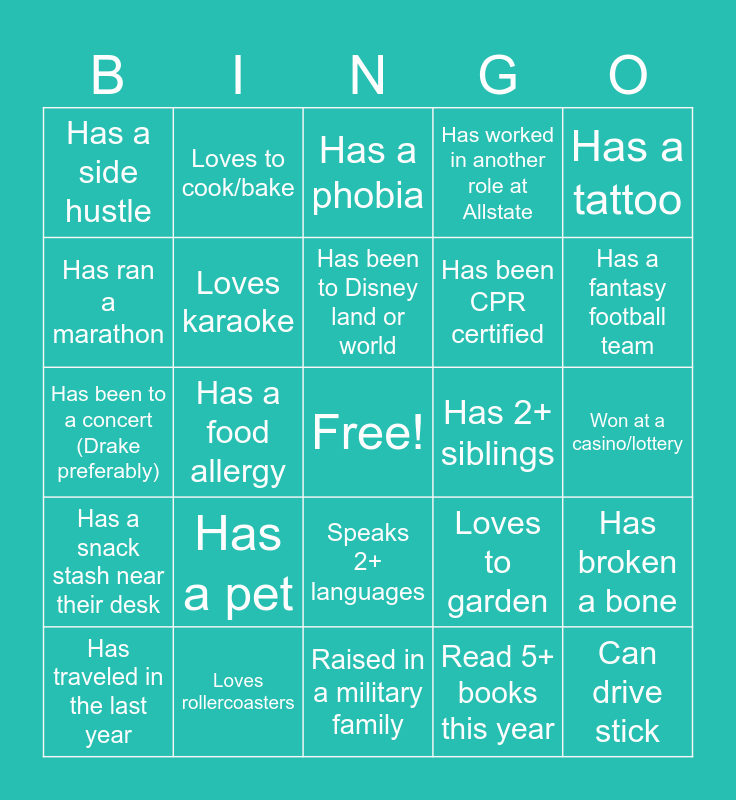 This bingo card has a free space and 24 words: Has a pet, Loves rollercoasters, Has been to Disney land or world, Has traveled in the last year, Has a tattoo, Has a side hustle, Has ran a marathon, Loves to cook/bake, Has 2+ siblings, Speaks 2+ languages, Has been CPR certified, Has been to a concert (Drake preferably), Loves to garden, Has broken a bone, Loves karaoke, Read 5+ books this year, Won at a casino/lottery, Has a phobia, Has a fantasy football team, Has a food allergy, Can drive stick, Has a snack stash near their desk, Has worked in another role at Allstate and Raised in a military family.