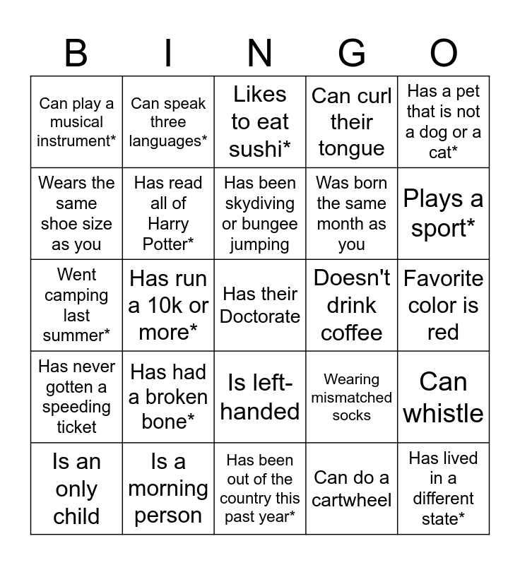 This bingo card has 25 words: Has had a broken bone*, Has been out of the country this past year*, Has been skydiving or bungee jumping, Is an only child, Has a pet that is not a dog or a cat*, Can play a musical instrument*, Wears the same shoe size as you, Can speak three languages*, Doesn't drink coffee, Is left-handed, Was born the same month as you, Went camping last summer*, Wearing mismatched socks, Can whistle, Has read all of Harry Potter*, Has lived in a different state*, Favorite color is red, Likes to eat sushi*, Plays a sport*, Has run a 10k or more*, Has their Doctorate, Is a morning person, Has never gotten a speeding ticket, Can curl their tongue and Can do a cartwheel.