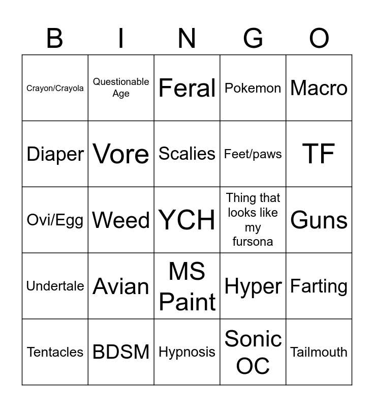This bingo card has a free space and 28 words: Farting, Inflation, Feet/paws, Sonic OC, Diaper, Feral, Questionable Age, Undertale, Thing that looks like my fursona, Tentacles, Ovi/Egg, Pokemon, BDSM, Hypnosis, TF, "Husky", Avian, Vore, Scalies, MS Paint, Crayon/Crayola, Crossdressing, Tailmouth, Weed, Guns, Hyper, Macro and Fnaf.