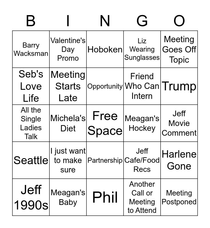 This bingo card has a free space and 24 words: I just want to make sure, Meagan's Baby, Opportunity, Jeff 1990s, Meeting Goes Off Topic, Barry Wacksman, Seb's Love Life, Valentine's Day Promo, Meagan's Hockey, Partnership, Friend Who Can Intern, All the Single Ladies Talk, Jeff Cafe/Food Recs, Harlene Gone, Meeting Starts Late, Another Call or Meeting to Attend, Jeff Movie Comment, Hoboken, Trump, Michela's Diet, Meeting Postponed, Seattle, Liz Wearing Sunglasses and Phil.