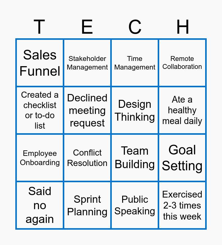 This bingo card has 25 words: CRM (Customer Relationship Management), Project Timeline, Team Building, SWOT Analysis, Sales Funnel, Stakeholder Management, Time Management, Remote Collaboration, Employee Onboarding, Conflict Resolution, Public Speaking, Goal Setting, KPI (Key Performance Indicator), Sprint Planning, Design Thinking, User Journey, Said no again, Declined meeting request, Took a 15 min break, Exercised 2-3 times this week, Created a checklist or to-do list, Complimented a co-worker, Did something fun, Ate a healthy meal daily and Cleaned your desk.