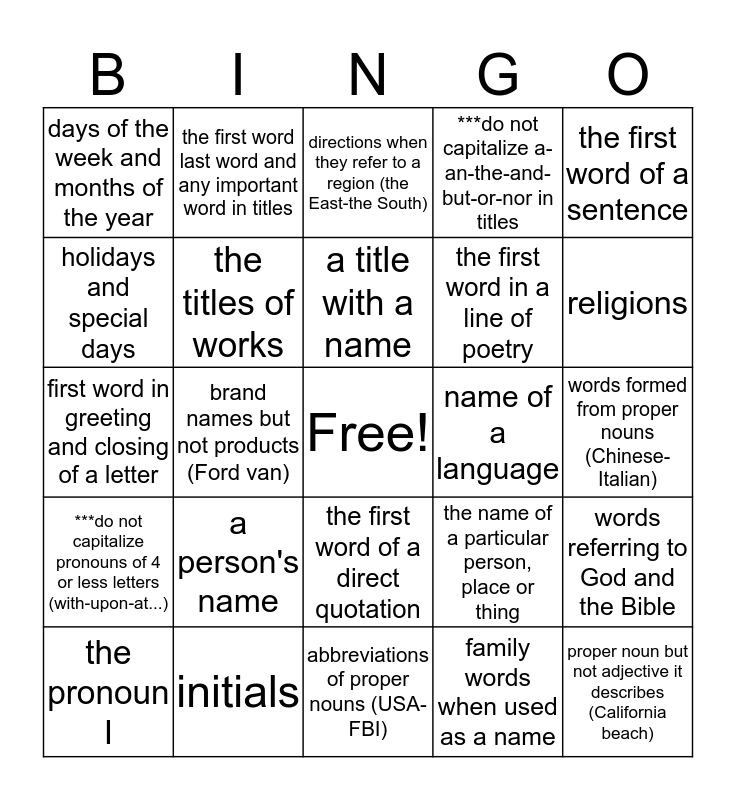 This bingo card has a free space and 24 words: a person's name, initials, a title with a name, the pronoun I, the first word of a sentence, days of the week and months of the year, holidays and special days, the first word last word and any important word in titles, name of a language, the first word of a direct quotation, the first word in a line of poetry, first word in greeting and closing of a letter, the name of a particular person, place or thing, words referring to God and the Bible, the titles of works, family words when used as a name, words formed from proper nouns (Chinese-Italian), directions when they refer to a region (the East-the South), religions, brand names but not products (Ford van), proper noun but not adjective it describes (California beach), ***do not capitalize pronouns of 4 or less letters (with-upon-at...), ***do not capitalize a-an-the-and-but-or-nor in titles and abbreviations of proper nouns (USA-FBI).