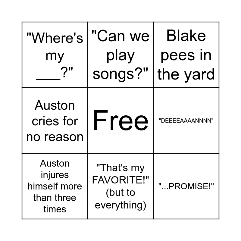 This bingo card has a free space and 8 words: "DEEEEAAAANNNN", Blake pees in the yard, "Can we play songs?", Auston injures himself more than three times, "Where's my ___?", "...PROMISE!", Auston cries for no reason and "That's my FAVORITE!" (but to everything).