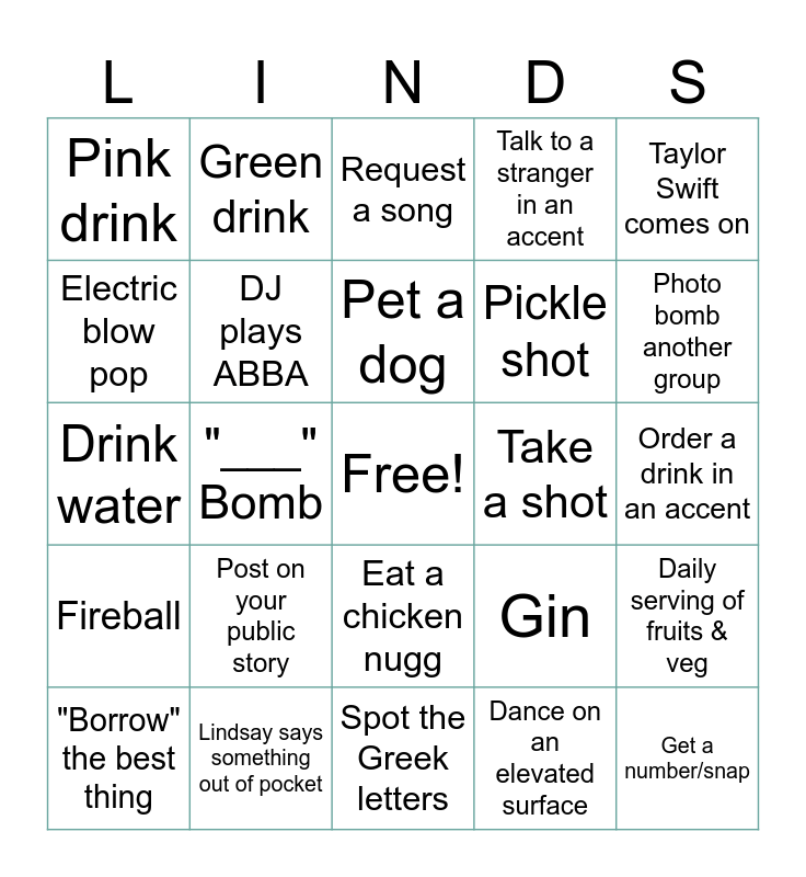 This bingo card has a free space and 44 words: Make a new friend, Get a number/snap, Collect 23 of something, "Borrow" the best thing, Make a whole lemon/lime, Dance on an elevated surface, Request a song, Suzanna is skipping, Taylor Swift comes on, Lindsay says something out of pocket, Talk to a stranger in an accent, Take a shot, Eat a chicken nugg, Post on your public story, Bathroom line, Spot the Greek letters, Another bday group, Drink water, Have a snack, Photo bomb another group, Green drink, Red drink, Blue drink, Pink drink, Somethings on fire, Order a drink in an accent, Tequila, Vodka, Gin, Fireball, Rum, Daily serving of fruits & veg, Cowboy hat, Birthday girl selfie, "___" Bomb, H20, Aggie themed drink, DJ rejected valid req for a song, Pet a dog, Electric blow pop, Pickle shot, Have a Mamma Mia moment, DJ plays ABBA and Name 10 sharks.