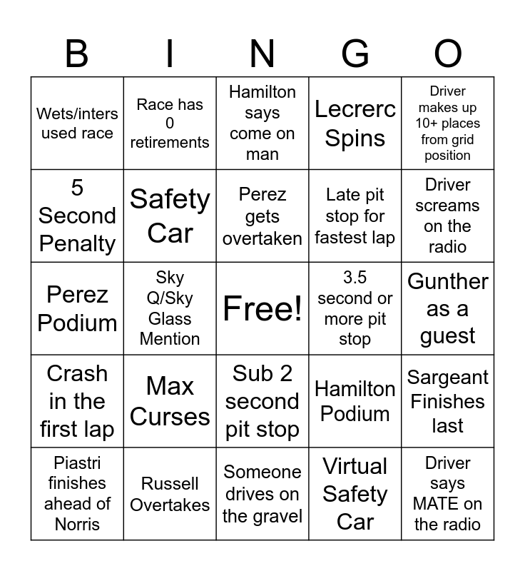 This bingo card has a free space and 24 words: Max Curses, Russell Overtakes, Perez gets overtaken, Piastri finishes ahead of Norris, Driver makes up 10+ places from grid position, Wets/inters used race, 5 Second Penalty, Race has 0 retirements, 3.5 second or more pit stop, Sub 2 second pit stop, Late pit stop for fastest lap, Perez Podium, Hamilton Podium, Sargeant Finishes last, Safety Car, Virtual Safety Car, Gunther as a guest, Hamilton says come on man, Driver screams on the radio, Sky Q/Sky Glass Mention, Driver says MATE on the radio, Crash in the first lap, Lecrerc Spins and Someone drives on the gravel.