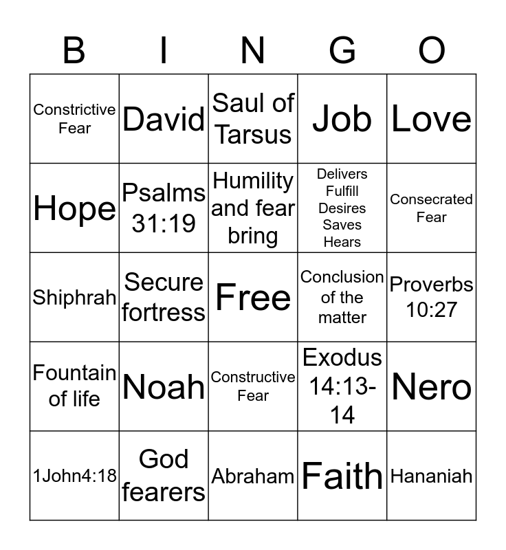 This bingo card has a free space and 24 words: Noah, God fearers, Humility and fear bring, 1John4:18, Love, Constrictive Fear, Hope, David, Conclusion of the matter, Constructive Fear, Delivers Fulfill Desires Saves Hears, Shiphrah, Exodus 14:13-14, Nero, Psalms 31:19, Faith, Proverbs 10:27, Saul of Tarsus, Consecrated Fear, Secure fortress, Hananiah, Fountain of life, Job and Abraham.