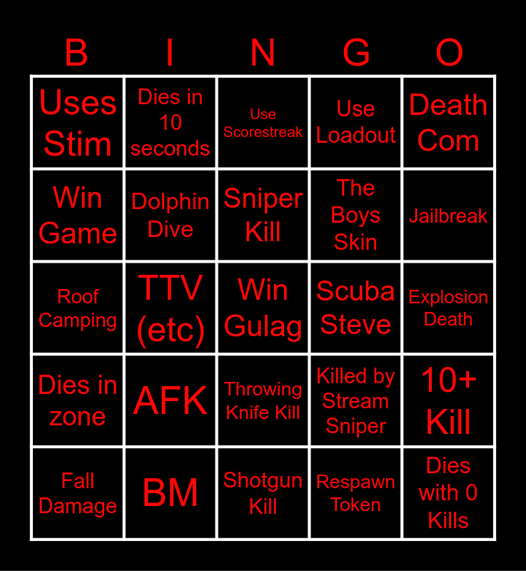 This bingo card has a free space and 24 words: AFK, BM, Sniper Kill, Fall Damage, Death Com, Uses Stim, Win Game, Dies in 10 seconds, Scuba Steve, Throwing Knife Kill, The Boys Skin, Roof Camping, Killed by Stream Sniper, 10+ Kill, Dolphin Dive, Respawn Token, Explosion Death, Use Scorestreak, Jailbreak, TTV (etc), Dies with 0 Kills, Dies in zone, Use Loadout and Shotgun Kill.