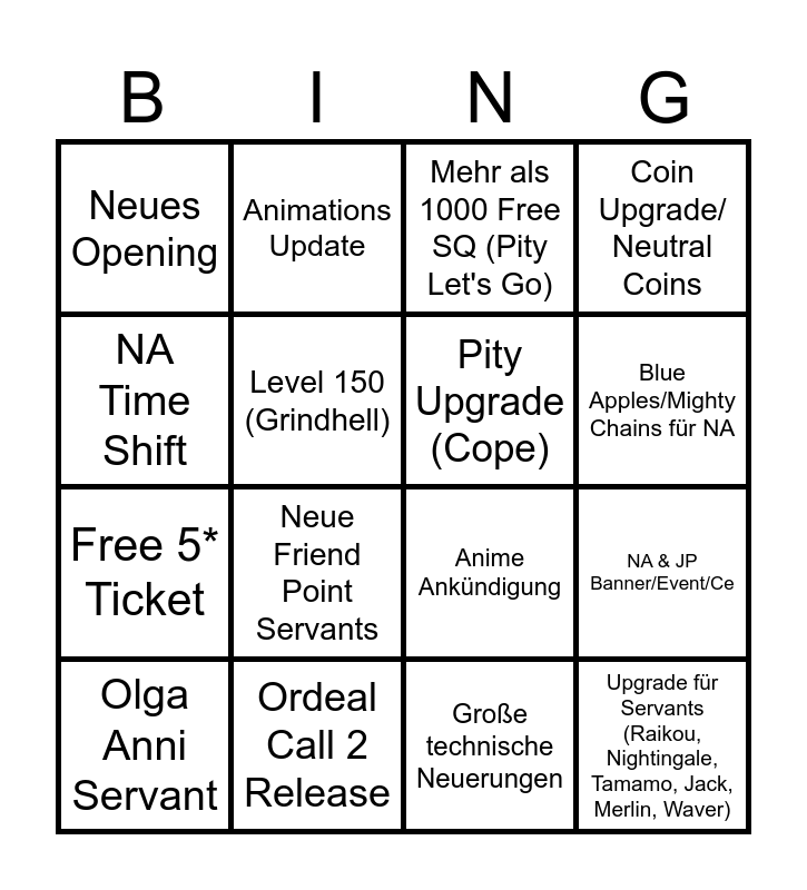 This bingo card has 16 words: Olga Anni Servant, Ordeal Call 2 Release, Mehr als 1000 Free SQ (Pity Let's Go), Coin Upgrade/ Neutral Coins, NA Time Shift, Animations Update, Anime Ankündigung, NA & JP Banner/Event/Ce, Neues Opening, Level 150 (Grindhell), Große technische Neuerungen, Blue Apples/Mighty Chains für NA, Free 5* Ticket, Neue Friend Point Servants, Pity Upgrade (Cope) and Upgrade für Servants (Raikou, Nightingale, Tamamo, Jack, Merlin, Waver).