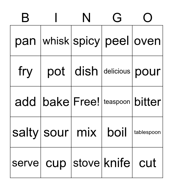 This bingo card has a free space and 28 words: bowl, cup, dish, knife, oven, pan, pot, stove, teaspoon, tablespoon, add, bake, boil, cut, fry, grill, mix, peel, pour, serve, whisk, sprinkle, delicious, bitter, salty, sour, spicy and sweet.