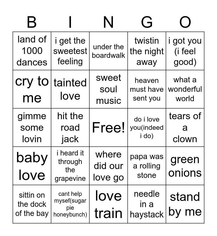 This bingo card has a free space and 24 words: i heard it through the grapevine, cant help mysef(sugar pie honeybunch), sweet soul music, sittin on the dock of the bay, i got you (i feel good), land of 1000 dances, cry to me, i get the sweetest feeling, do i love you(indeed i do), where did our love go, heaven must have sent you, gimme some lovin, papa was a rolling stone, green onions, tainted love, needle in a haystack, tears of a clown, under the boardwalk, what a wonderful world, hit the road jack, stand by me, baby love, twistin the night away and love train.