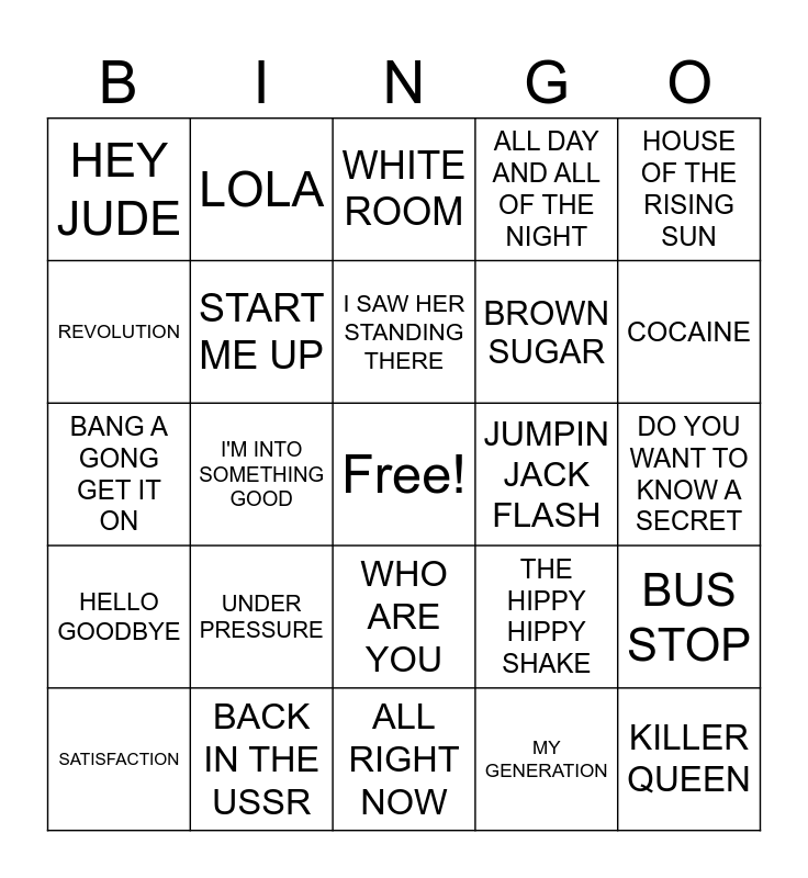 This bingo card has a free space and 44 words: DAY TRIPPER, KILLER QUEEN, WHOLE LOTTA LOVE, SATISFACTION, SMOKE ON THE WATER, MY GENERATION, WHITE ROOM, YOU REALLY GOT ME, HOUSE OF THE RISING SUN, BACK IN THE USSR, ALL DAY AND ALL OF THE NIGHT, JUMPIN JACK FLASH, WHO ARE YOU, UNDER PRESSURE, REBEL REBEL, ALL RIGHT NOW, PAINT IT BLACK, BANG A GONG GET IT ON, PINBALL WIZARD, COCAINE, LOLA, BLACK DOG, SUNSHINE OF YOUR LOVE, HEY JUDE, DON'T LET ME BE MISUNDERSTOOD, DO YOU WANT TO KNOW A SECRET, GLAD ALL OVER, I CAN'T EXPLAIN, THE HIPPY HIPPY SHAKE, HELLO GOODBYE, WILD THING, BUS STOP, SHE LOVES YOU, GLORIA, I'M INTO SOMETHING GOOD, HONKY TONK WOMEN, CAN'T BUT ME LOVE, I WANT TO HOLD YOUR HAND, I SAW HER STANDING THERE, REVOLUTION, BROWN SUGAR, COME TOGETHER, START ME UP and A HARD DAYS NIGHT.