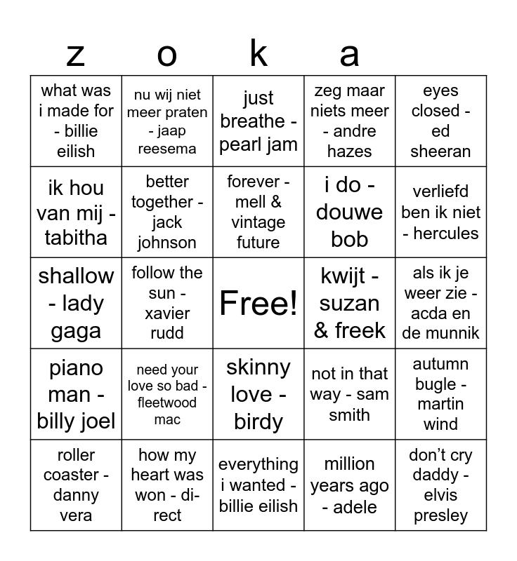 This bingo card has a free space and 42 words: sign of the times - harry styles, forever - mell & vintage future, impossible - nothing but thieves, need your love so bad - fleetwood mac, million years ago - adele, autumn bugle - martin wind, don’t cry daddy - elvis presley, hou me vast - volumia, just breathe - pearl jam, skinny love - birdy, als ik je weer zie - acda en de munnik, verliefd ben ik niet - hercules, follow the sun - xavier rudd, eyes closed - ed sheeran, vampire - olivia rodrigo, not in that way - sam smith, lay me down - sam smith, shallow - lady gaga, als het avond is - suzan & freek, nu wij niet meer praten - jaap reesema, ik hou van mij - tabitha, verleden tijd - flemming, another love - tom odell, what was i made for - billie eilish, jij bent de liefde - maan, always remember us this way - lady gaga, i do - douwe bob, vincent - sophia, back to you - hannah mae, dat heb jij gedaan - meau, stiekem - maan & goldband, piano man - billy joel, better together - jack johnson, everything i wanted - billie eilish, good 4 u - olivia rodrigo, roller coaster - danny vera, how my heart was won - di-rect, kwijt - suzan & freek, cello suite 1- bach, vivo per lei - andrea bocelli, zeg maar niets meer - andre hazes and mens durf te leven - wende.