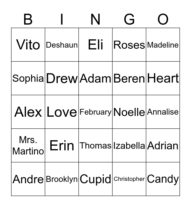 This bingo card has a free space and 24 words: Erin, Brooklyn, Adam, Andre, Madeline, Vito, Sophia, Deshaun, Noelle, Thomas, Beren, Alex, Izabella, Adrian, Drew, Christopher, Annalise, Eli, Heart, Love, Candy, Mrs. Martino, Roses and Cupid.