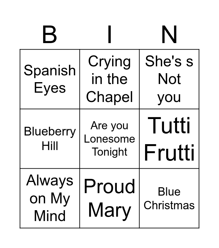 This bingo card has a free space and 8 words: Tutti Frutti, She's s Not you, Crying in the Chapel, Always on My Mind, Spanish Eyes, Blue Christmas, Blueberry Hill and Proud Mary.
