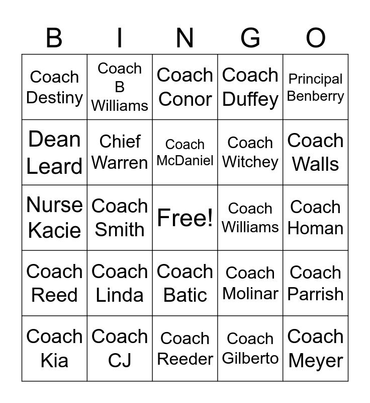 This bingo card has a free space and 26 words: Coach Batic, Coach Gilberto, Coach McDaniel, Coach CJ, Principal Benberry, Coach Destiny, Dean Leard, Coach B Williams, Coach Homan, Coach Molinar, Coach Witchey, Nurse Kacie, Coach Parrish, Coach Kia, Coach Smith, Coach Lee, Coach Duffey, Coach Reed, Coach Conor, Coach Meyer, Coach Walls, Coach Reeder, Coach Williams, Coach Linda, Chief Warren and Coach Vonnah.