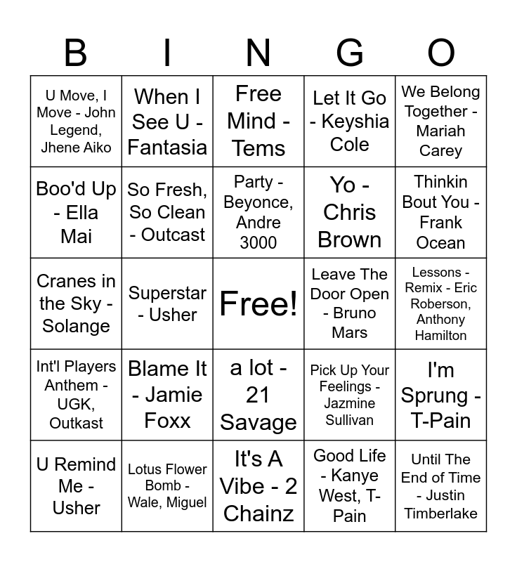 This bingo card has a free space and 34 words: No Guidance - Chris Brown, Drake, Good Life - Kanye West, T-Pain, Slow Jamz - Twista, Kanye West, Jamie Foxx, Mrs. Officer - Lil Wayne, Int'l Players Anthem - UGK, Outkast, So Fresh, So Clean - Outcast, We Belong Together - Mariah Carey, U Remind Me - Usher, When I See U - Fantasia, Best Part - Daniel Caesar, H.E.R., Party - Beyonce, Andre 3000, Free Mind - Tems, Pressure - Ari Lennox, Best of Me - Anthony Hamilton, Leave The Door Open - Bruno Mars, Thinkin Bout You - Frank Ocean, Lotus Flower Bomb - Wale, Miguel, Cranes in the Sky - Solange, Blame It - Jamie Foxx, Pick Up Your Feelings - Jazmine Sullivan, a lot - 21 Savage, All The Starz - Kendrick Lamar, SZA, U Move, I Move - John Legend, Jhene Aiko, Lessons - Remix - Eric Roberson, Anthony Hamilton, It's A Vibe - 2 Chainz, Until The End of Time - Justin Timberlake, Let It Go - Keyshia Cole, Just Friends - Musiq Soulchild, Yo - Chris Brown, Boo'd Up - Ella Mai, Essence - Wizkid, Tems, Superstar - Usher, I'm Sprung - T-Pain and Best I Ever Had - Drake.