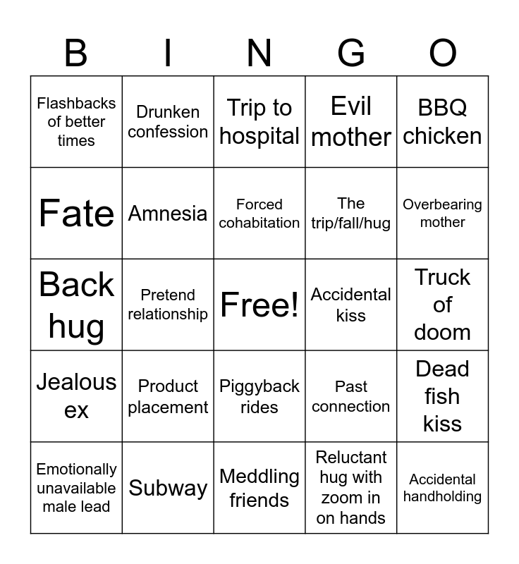 This bingo card has a free space and 24 words: Product placement, Subway, Forced cohabitation, Emotionally unavailable male lead, BBQ chicken, Flashbacks of better times, Fate, Drunken confession, Accidental kiss, Piggyback rides, The trip/fall/hug, Back hug, Past connection, Dead fish kiss, Amnesia, Reluctant hug with zoom in on hands, Truck of doom, Trip to hospital, Overbearing mother, Pretend relationship, Accidental handholding, Jealous ex, Evil mother and Meddling friends.