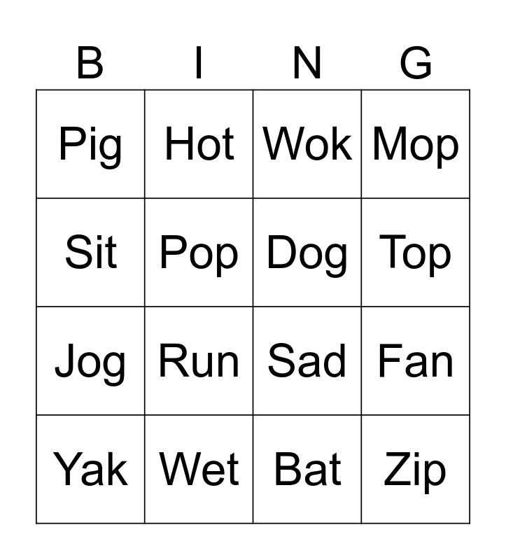 This bingo card has 24 words: Cat, Sun, Bat, Zip, Pig, Hot, Dog, Mop, Jog, Wet, Vet, Top, Jam, Nut, Sad, Hen, Yak, Pop, Gum, Fan, Sit, Run, Wok and Mud.
