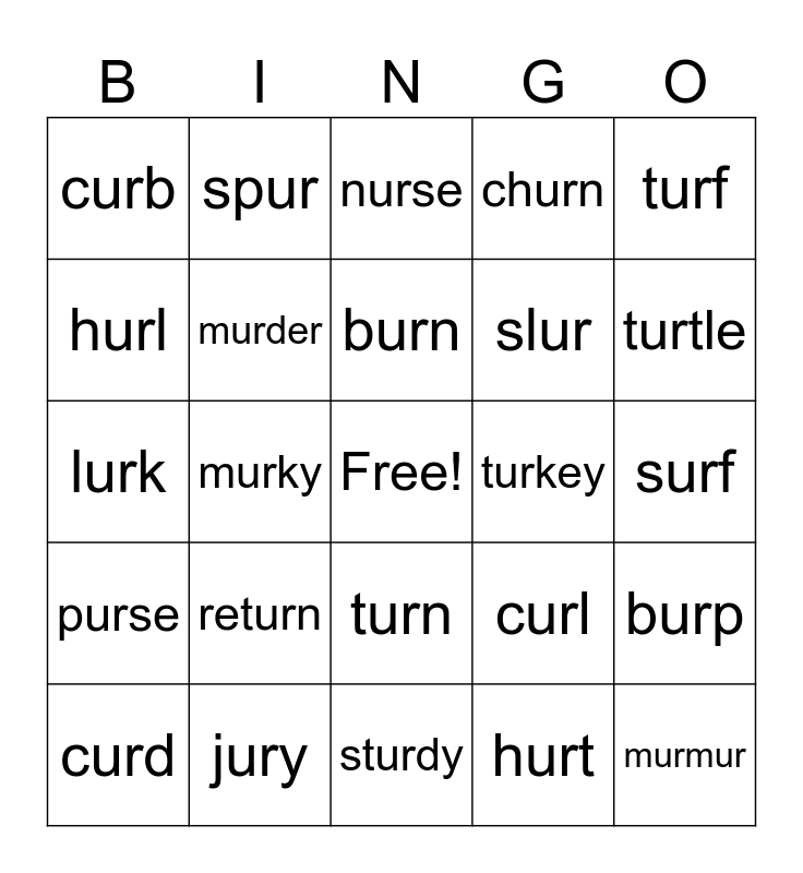 This bingo card has a free space and 26 words: turn, hurt, burn, jury, turf, curb, hurl, spur, surf, curl, slur, lurk, burp, curd, murky, blurt, churn, purse, nurse, murmur, turtle, sturdy, turkey, return, murder and survey.