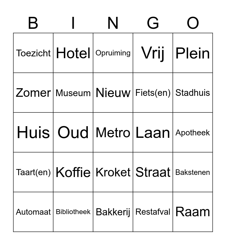 This bingo card has 54 words: Patat, Taart(en), IJs, Eethuis, Kroket, Kliniek, Vrij, Lekker, Zomer, Afhalen, Toezicht, Oplaadpunt, Bibliotheek, Automaat, Uitgezonderd, Bakkerij, Metro, Fiets(en), Sport, Apotheek, Straat, Weg, Laan, Plein, Opvang, Hotel, Kapsalon, Kapper, Welkom, Restafval, Verboden, Open, Kassa, Uitverkoop, Opruiming, Voordeel, Huis, Bakstenen, Raam, Museum, Park, Reparatie, Sieraden, Informatie, Koffie, Thee, Academie, Ingang, Nieuw, Oud, Stadhuis, Ring, Halte and Toegang.