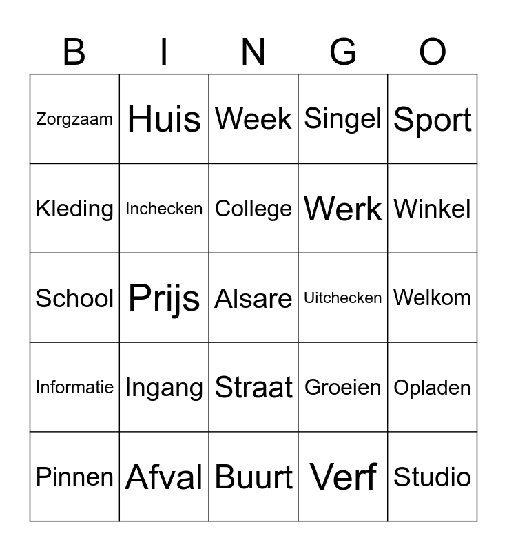 This bingo card has a free space and 67 words: Weg, Garage, Metro, Opladen, Voertuig(en), Gast, Huis, Hout, College, Lijn, Straat, Peuterschool, Welkom, Sport, Hond(en), Kleding, Prijs, Zorgzaam, Papier, Werk, Ingang, Informatie, Singel, Verf, Hof, Verboden, Terrein, Veiligheid, Winkel, Brood, Studio, Alleen, Bakkerij, Pizzeria, Hier, Pinnen, Samen, Groeien, School, Supermarkt, Halte, Inchecken, Uitchecken, Laan, Geld, Stichting, Eigendom, Afval, Rest, Dag(en), Week, Snel, Pad, Uitlaatplaats, Gemeente, Buurt, Bedrijf, Thuiszorg, Parkeren, Zorg, Hotel, Gymzaal, Broodje, Vriend, Ontmoeting, Geopend and Gesloten.