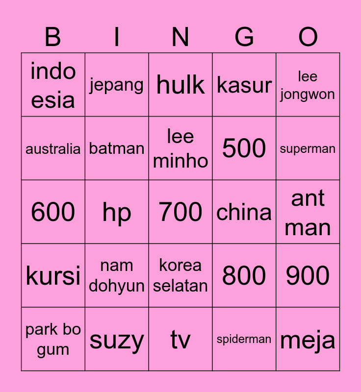 This bingo card has a free space and 24 words: nam dohyun, suzy, lee minho, park bo gum, lee jongwon, indo esia, australia, jepang, china, korea selatan, 500, 600, 800, 900, batman, spiderman, ant man, hulk, superman, hp, meja, kursi, kasur and tv.