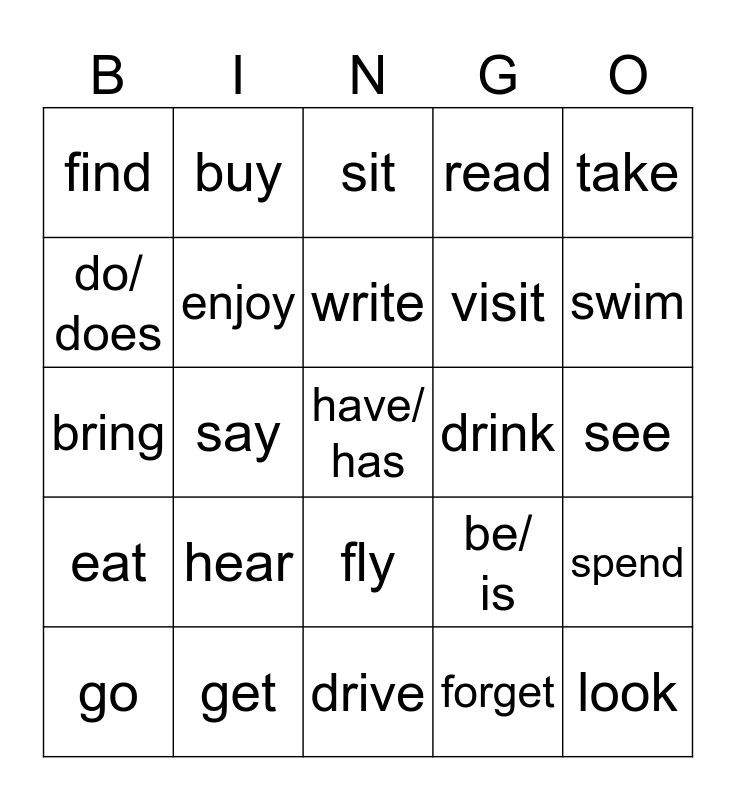 This bingo card has a free space and 24 words: hear, get, write, go, take, find, do/ does, buy, drink, fly, visit, bring, be/ is, spend, enjoy, forget, see, sit, swim, say, look, eat, read and drive.