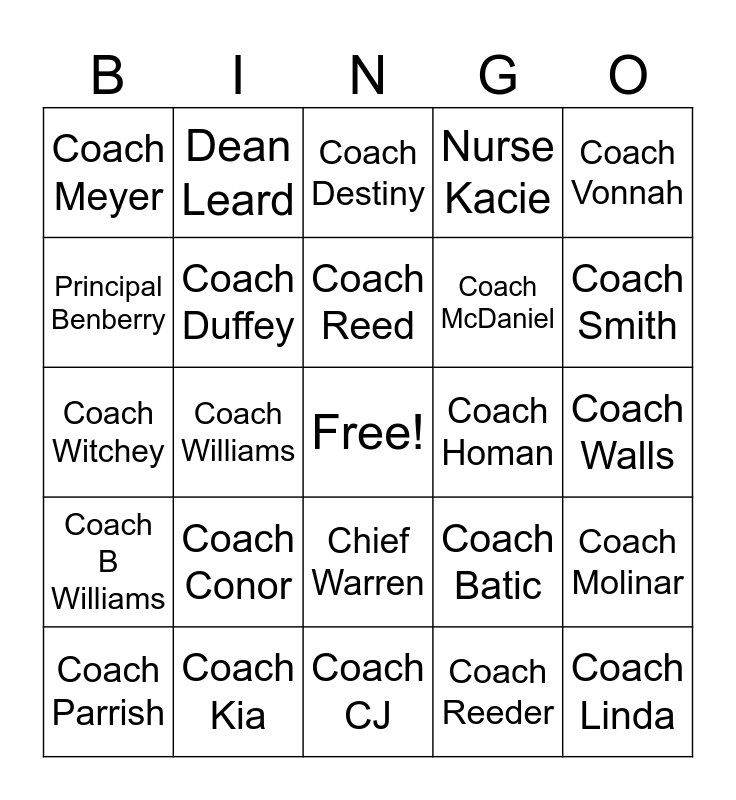 This bingo card has a free space and 27 words: Coach Batic, Coach Gilberto, Coach McDaniel, Coach CJ, Principal Benberry, Coach Destiny, Dean Leard, Coach B Williams, Coach Homan, Coach Molinar, Coach Witchey, Nurse Kacie, Coach Parrish, Coach Kia, Coach Smith, Coach Lee, Coach Duffey, Coach Reed, Coach Conor, Coach Meyer, Coach Walls, Coach Reeder, Coach Williams, Coach Linda, Chief Warren, Coach Vonnah and Coach Dannielle.