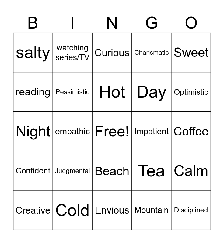 This bingo card has a free space and 26 words: Beach, Mountain, Hot, Cold, Sweet, salty, reading, watching series/TV, Coffee, Tea, Day, Night, Calm, Creative, empathic, Brave, Charismatic, Confident, Curious, Disciplined, Optimistic, Envious, Impatient, Judgmental, Pessimistic and Punctual.