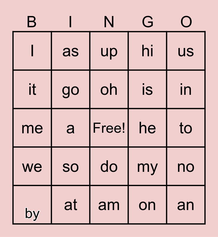 This bingo card has a free space and 29 words: by, of, a, be, I, up, go, so, he, at, to, an, am, on, in, or, do, we, us, me, my, if, is, it, hi, as, no, oh and ma.