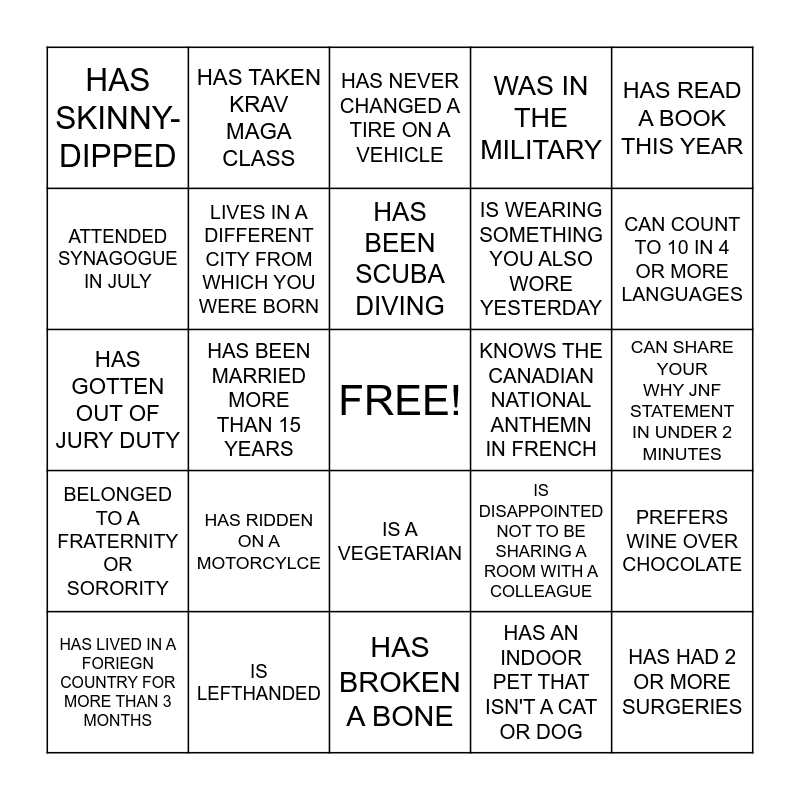 This bingo card has a free space and 24 words: HAS RIDDEN ON A MOTORCYLCE, IS LEFTHANDED, HAS BEEN SCUBA DIVING, HAS LIVED IN A FORIEGN COUNTRY FOR MORE THAN 3 MONTHS, HAS READ A BOOK THIS YEAR, HAS SKINNY- DIPPED, ATTENDED SYNAGOGUE IN JULY, HAS TAKEN KRAV MAGA CLASS, KNOWS THE CANADIAN NATIONAL ANTHEMN IN FRENCH, IS A VEGETARIAN, IS WEARING SOMETHING YOU ALSO WORE YESTERDAY, HAS GOTTEN OUT OF JURY DUTY, IS DISAPPOINTED NOT TO BE SHARING A ROOM WITH A COLLEAGUE, PREFERS WINE OVER CHOCOLATE, LIVES IN A DIFFERENT CITY FROM WHICH YOU WERE BORN, HAS AN INDOOR PET THAT ISN'T A CAT OR DOG, CAN SHARE YOUR WHY JNF STATEMENT IN UNDER 2 MINUTES, HAS NEVER CHANGED A TIRE ON A VEHICLE, CAN COUNT TO 10 IN 4 OR MORE LANGUAGES, HAS BEEN MARRIED MORE THAN 15 YEARS, HAS HAD 2 OR MORE SURGERIES, BELONGED TO A FRATERNITY OR SORORITY, WAS IN THE MILITARY and HAS BROKEN A BONE.