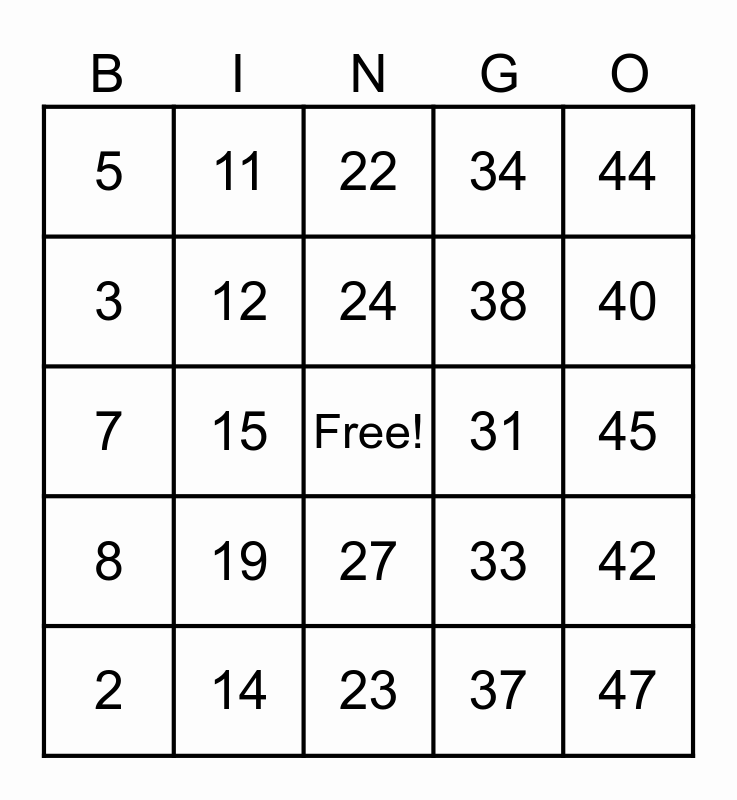 This bingo card has a free space and 48 words: 1, 10, 20, 30, 40, 2, 11, 21, 31, 41, 3, 12, 32, 42, 4, 13, 22, 33, 43, 5, 14, 23, 34, 44, 6, 15, 24, 35, 45, 7, 16, 25, 36, 46, 8, 17, 26, 37, 47, 9, 18, 27, 38, 48, 19, 28, 39 and 49.