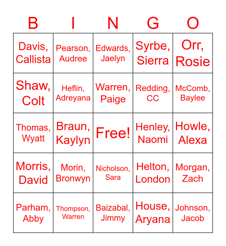 This bingo card has a free space and 31 words: Baizabal, Jimmy, Biggs, Lola, Braun, Kaylyn, Daniel, Gracie, Davis, Callista, Edwards, Jaelyn, Heflin, Adreyana, Helton, London, Henley, Naomi, House, Aryana, Howle, Alexa, Johnson, Jacob, Jones, Kasen, Karr, Tucker, McComb, Baylee, McCoy, Tyler-Austin, Morgan, Zach, Morin, Bronwyn, Morris, David, Nicholson, Sara, Orr, Rosie, Ortiz, Alina, Parham, Abby, Pearson, Audree, Redding, CC, Shaw, Colt, Syrbe, Sierra, Thomas, Wyatt, Thompson, Warren, Warren, Paige and Wiggins, Blake.