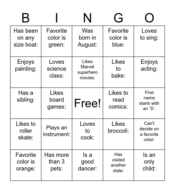 This bingo card has a free space and 29 words: Favorite color is orange:, Plays a sport:, Likes board games:, Favorite ice cream is chocolate:, Has been on any size boat:, Was born in August:, Loves science class:, Plays an instrument:, Likes to read comics:, Has more than 3 pets:, First name starts with an āSā:, Is an only child:, Is a good dancer:, Has visited another state:, Enjoys acting:, Plays Roblox:, Loves to cook:, Likes to roller skate:, Loves to sing:, Has a sibling:, Likes broccoli:, Has visited another country:, Likes to bake:, Enjoys painting:, Favorite color is blue:, Favorite color is green:, Can't decide on a favorite color:, Likes Marvel superhero movies: and Likes to go bowling:.