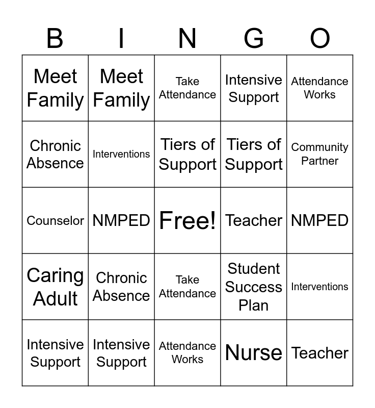 This bingo card has a free space and 75 words: Document Everything!, Intensive Support, Take Attendance, Attendance For Success, Data, Attendance Team, Caring Adult, School Plan, Social Worker, Call student, Student Success Plan, Community Partner, Tiers of Support, Chronic Absence, Resources, NMPED, Nurse, Teacher, Engaging Classroom, Attendance Works, 10%, Counselor, Interventions, Meet Family, Intensive Support, Take Attendance, Call student, Attendance For Success, Data, Attendance Team, Caring Adult, Document Everything!, Social Worker, Student Success Plan, Community Partner, Tiers of Support, School Plan, Chronic Absence, NMPED, Nurse, Resources, Teacher, Engaging Classroom, 10%, Counselor, Interventions, Intensive Support, Meet Family, Attendance Works, Student Success Plan, Intensive Support, Take Attendance, Tiers of Support, Call student, Attendance For Success, Community Partner, Document Everything!, Social Worker, Community Partner, School Plan, Chronic Absence, NMPED, Nurse, Data, Resources, Teacher, Engaging Classroom, 10%, Counselor, Interventions, Caring Adult, Intensive Support, Meet Family, Attendance Works and Attendance Team.