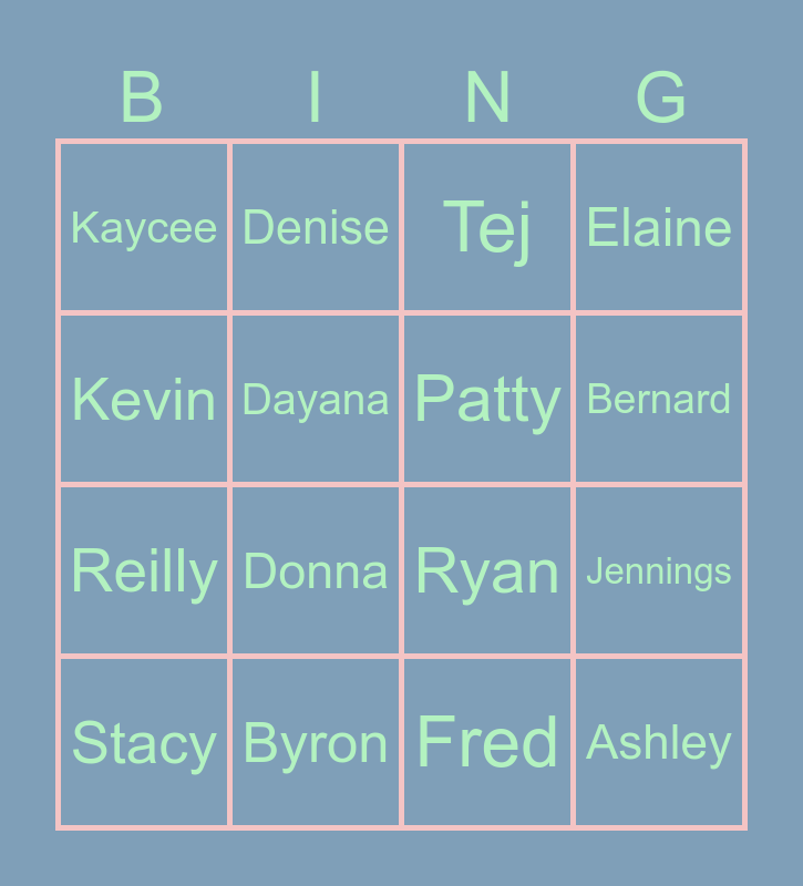 This bingo card has 16 words: Stacy, Byron, Tej, Elaine, Kevin, Denise, Ryan, Jennings, Kaycee, Dayana, Fred, Bernard, Reilly, Donna, Patty and Ashley.