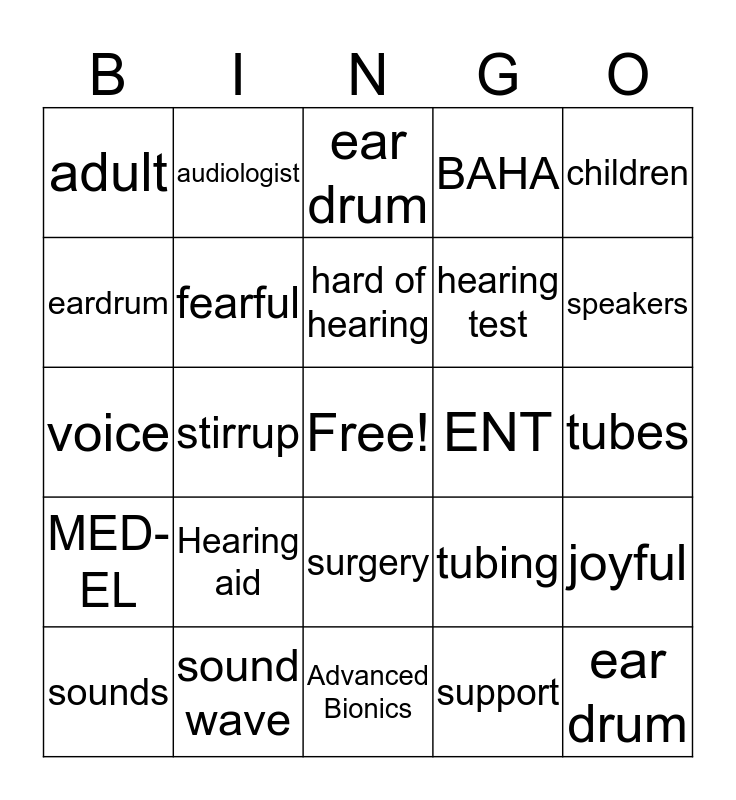 This bingo card has a free space and 24 words: Hearing aid, sound wave, hard of hearing, sounds, children, adult, eardrum, audiologist, ENT, surgery, hearing test, voice, tubing, joyful, fearful, support, tubes, ear drum, speakers, stirrup, ear drum, MED-EL, BAHA and Advanced Bionics.
