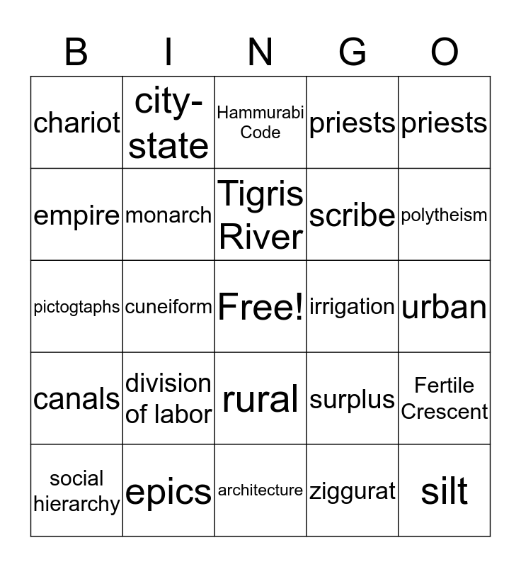This bingo card has a free space and 24 words: division of labor, epics, Tigris River, social hierarchy, priests, chariot, empire, city-state, irrigation, rural, scribe, pictogtaphs, surplus, Fertile Crescent, monarch, ziggurat, urban, Hammurabi Code, polytheism, cuneiform, silt, canals, priests and architecture.
