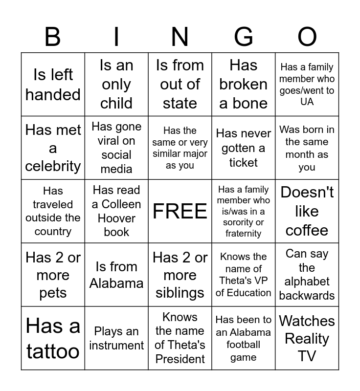 This bingo card has a free space and 24 words: Is from Alabama, Plays an instrument, Has the same or very similar major as you, Has a tattoo, Has a family member who goes/went to UA, Is left handed, Has met a celebrity, Is an only child, Has a family member who is/was in a sorority or fraternity, Has 2 or more siblings, Has never gotten a ticket, Has traveled outside the country, Knows the name of Theta's VP of Education, Can say the alphabet backwards, Has gone viral on social media, Has been to an Alabama football game, Doesn't like coffee, Is from out of state, Was born in the same month as you, Has read a Colleen Hoover book, Watches Reality TV, Has 2 or more pets, Has broken a bone and Knows the name of Theta's President.