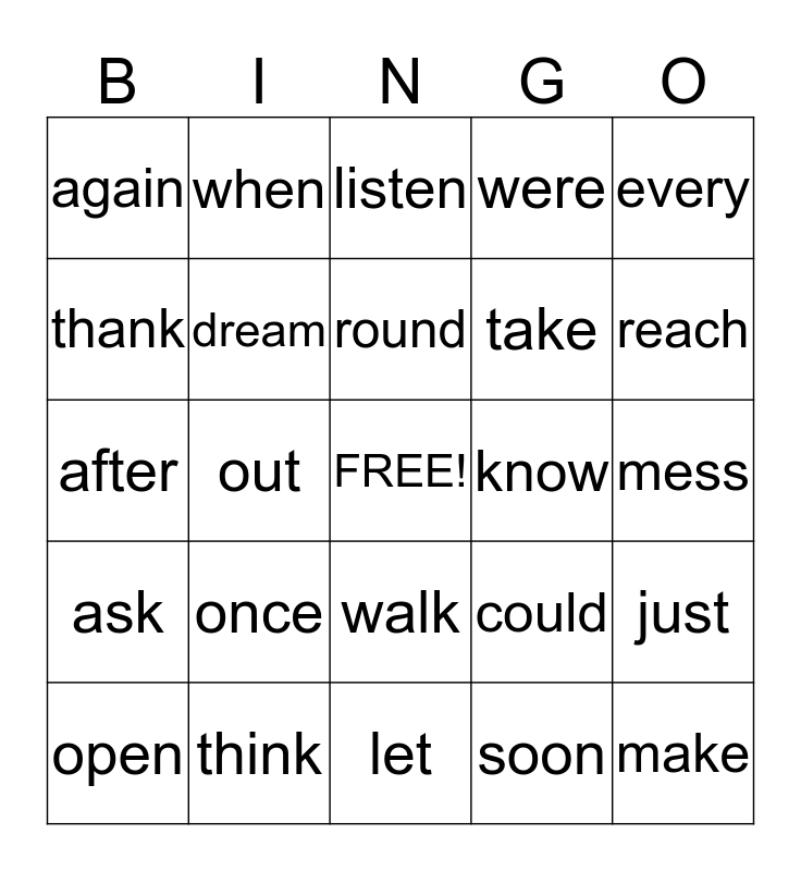 This bingo card has a free space and 24 words: once, think, round, open, every, again, thank, when, know, walk, take, after, could, just, dream, soon, mess, listen, reach, out, make, ask, were and let.
