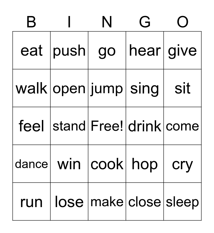 This bingo card has a free space and 24 words: win, lose, jump, run, give, eat, walk, push, drink, cook, sing, feel, hop, cry, open, close, come, go, sit, stand, sleep, dance, hear and make.