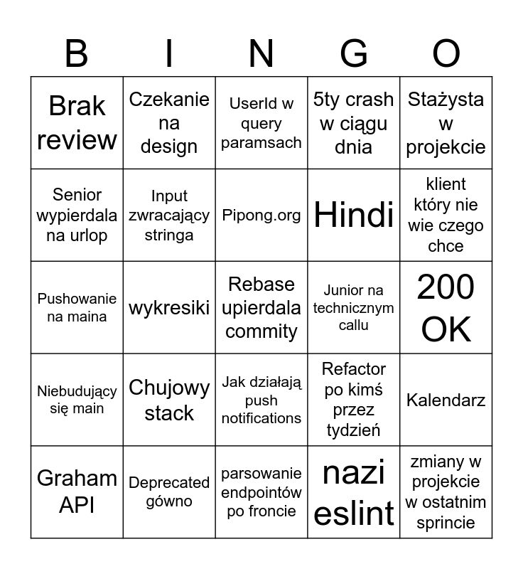 This bingo card has a free space and 24 words: Chujowy stack, Deprecated gówno, Pipong.org, Graham API, Stażysta w projekcie, Brak review, Senior wypierdala na urlop, Czekanie na design, Junior na technicznym callu, Jak działają push notifications, Hindi, Pushowanie na maina, Refactor po kimś przez tydzień, Kalendarz, Input zwracający stringa, nazi eslint, 200 OK, UserId w query paramsach, klient który nie wie czego chce, wykresiki, zmiany w projekcie w ostatnim sprincie, Niebudujący się main, 5ty crash w ciągu dnia and parsowanie endpointów po froncie.