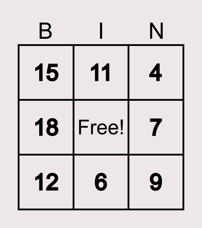 This bingo card has a free space and 11 words: 3, 6, 9, 12, 11, 4, 7, 10, 18, 15 and 13.